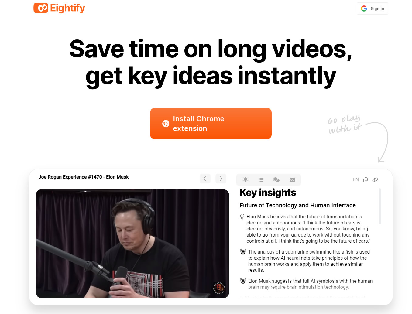 Eightify-AI is a versatile tool designed to enhance the functionality and engagement of YouTube videos. It aims to empower creators and marketers with robust tools to elevate their YouTube content, improve audience engagement, and achieve strategic goals effectively.